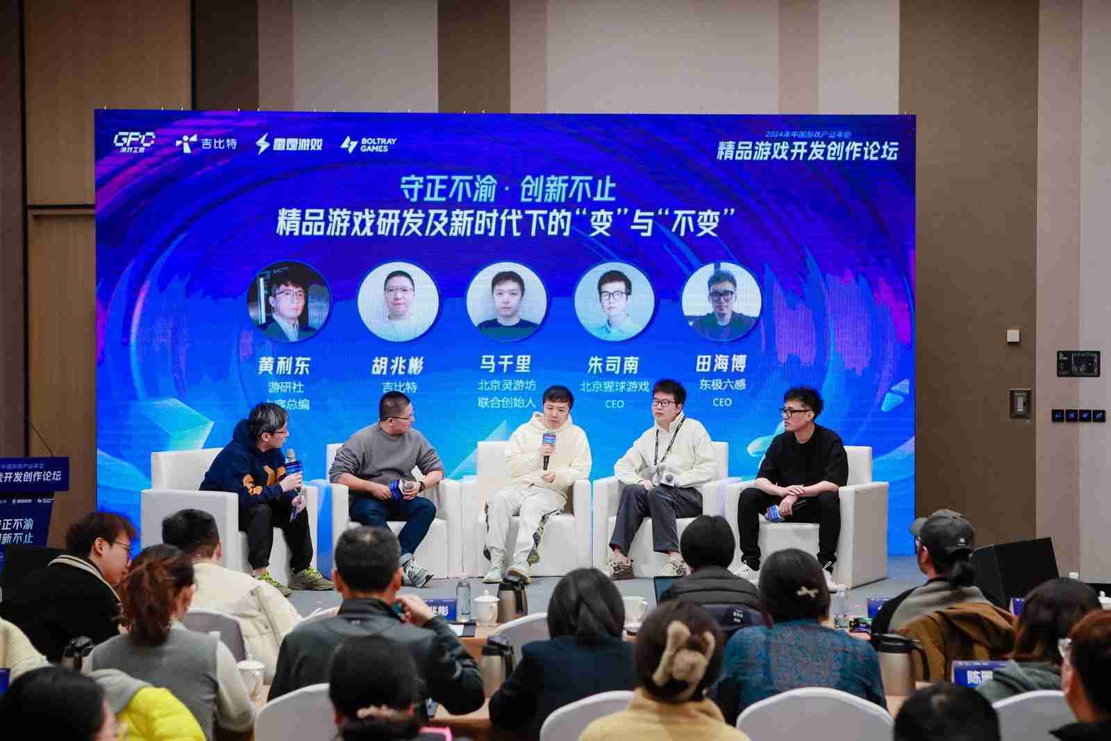 圆桌对话环节,,在游研社内容总编黄利东的主持下,,J9.COMCTO胡兆彬、、、北京灵游坊联合创始人马千里、、、、北京猩球游戏CEO朱司南、、东极六感CEO田海博等四位嘉宾围绕“守正不渝、、创新不止——精品游戏研发及新时代下的‘变’与‘不变’”这一主题分享了各自在精品游戏开发理念及工程能力搭建方面的见解和经历,,,,并就行业变化下游戏人需要坚守的理念等展开交流探讨。。。。