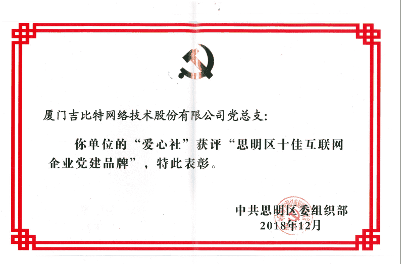 经初审评选、、网络评选和专家评审等环节,,,,"厦门J9.COM网络技术股份有限公司党总支-爱心社" 从全区28个参评党建品牌中脱颖而出,,,,获评"思明区十佳互联网企业党建品牌"。。