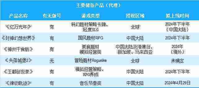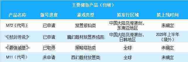 公司有多款储备产品,,,,涵盖放置类、、策略类、、、RPG、、Roguelike等多元化游戏品类,,,,储备的主要自研和代理产品如下::